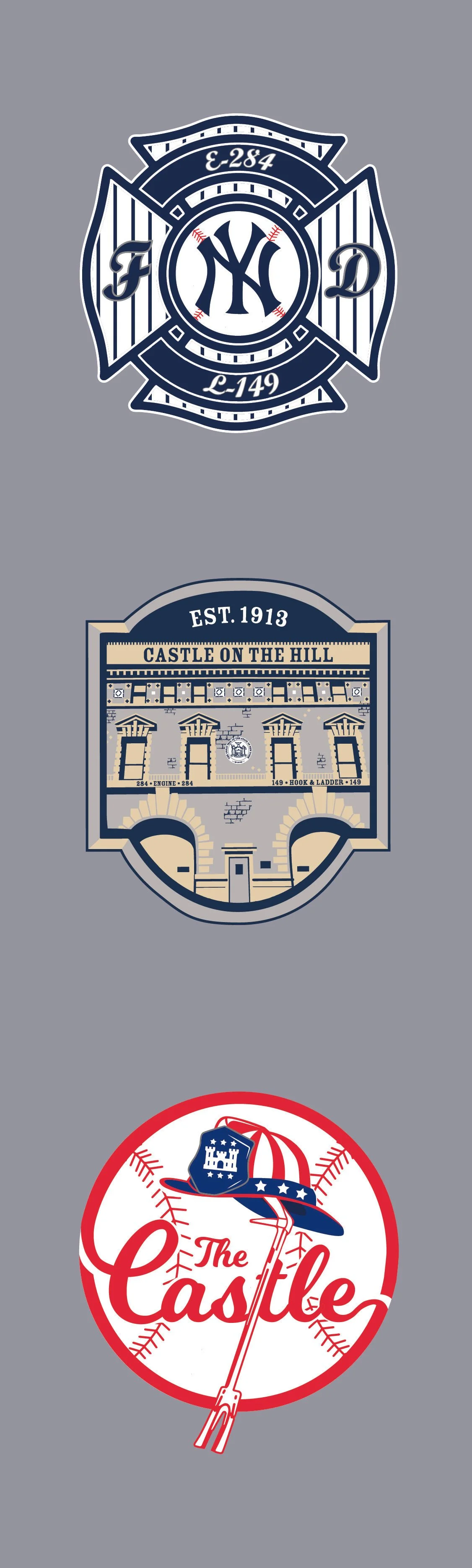 The full back design drew inspiration from the classic Yankees logo: the red script over a baseball, the bat forming the "K", and the Uncle Sam hat perched on top. I reimagined each of these elements to reflect the spirit of the firehouse. “The Castle” replaced “Yankees,” a halligan tool (a key piece of firefighting equipment) formed the vertical line of the "t", and the Uncle Sam hat was swapped for a firefighter’s helmet. To maintain a sense of homage, the helmet retained design elements like stars and stripes from the original.